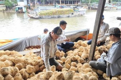 Thu mua dừa khô nguyên liệu trên địa bàn xã Giồng Trôm, tỉnh Vĩnh Long. Ảnh: Huỳnh Phúc Hậu/TTXVN) Bà Nguyễn…
