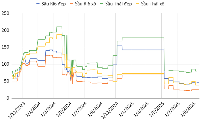 Sầu riêng Ri6 loại đệp ổn định trong khoảng 42.000 – 50.000 đồng/kg, loại B 27.000 – 30.000 đồng/kg, Ri6 lỗi dao động ở 17.000 – 20.000 đồng/kg.