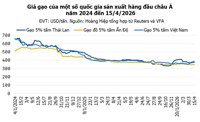 Trên thị trường xuất khẩu, theo số liệu từ Hiệp hội Lương thực Việt Nam (VFA), giá gạo thơm 5% tấm của Việt Nam hiện dao động ở mức 460–465 USD/tấn; gạo Jasmine ở mức 454–458 USD/tấn; trong khi gạo trắng thường 5% tấm được giao dịch trong khoảng 372–376 USD/tấn.