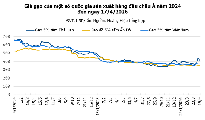 Đáng chú ý, theo dữ liệu từ Hiệp hội Lương thực Việt Nam (VFA), giá gạo thơm 5% tấm của Việt Nam đã tăng vọt 15 USD/tấn trong ngày 16/4, lên mức 475 – 485 USD/tấn. Tính chung trong tuần qua, gạo thơm của Việt Nam đã tăng tổng cộng 25 USD/tấn.