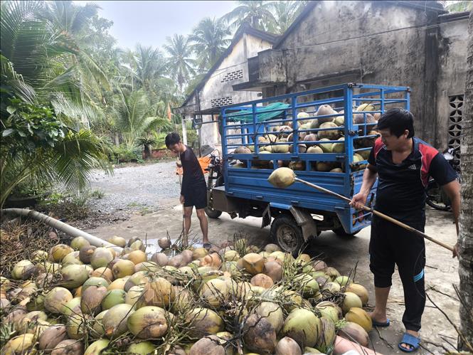 Thu mua dừa khô nguyên liệu trên địa bàn xã Giồng Trôm, tỉnh Vĩnh Long. Ảnh: Huỳnh Phúc Hậu/TTXVN)