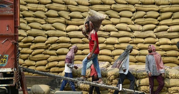 Công nhân vận chuyển gạo tại nhà kho ở Jalandhar, Ấn Độ. (Ảnh: ANI/TTXVN)