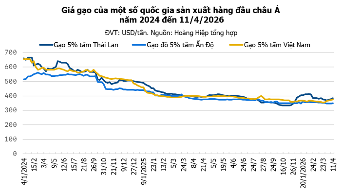 Trên thị trường xuất khẩu, theo dữ liệu từ Hiệp hội Lương thực Việt Nam (VFA), gạo trắng 5% tấm của Việt Nam tăng 4 USD/tấn so với ngày hôm trước, lên mức 372 – 376 USD/tấn. Tương tự, giá gạo Jasmine tăng 7 USD/tấn, lên 454– 458 USD/tấn. Đặc biệt, gạo thơm 5% tấm tăng mạnh 15 USD/tấn, đạt 454 – 460 USD/tấn.