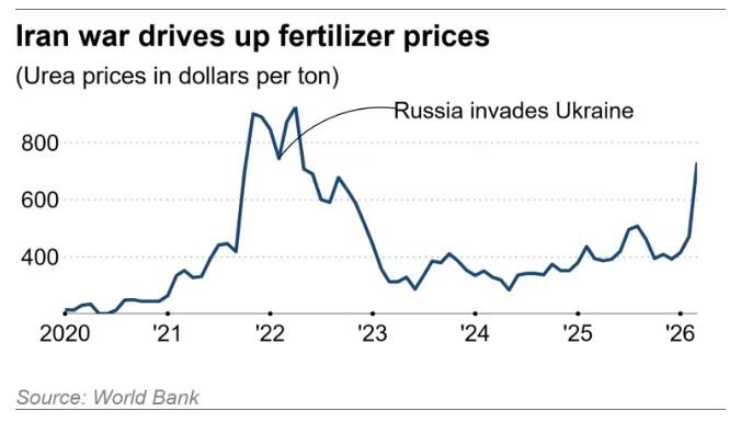 Theo Nikkei Asia, xung đột tại Iran khiến giá phân bón tăng vọt do đóng cửa eo biển Hormuz làm đình trệ các chuyến hàng từ Trung Đông, đe dọa an ninh lương thực toàn cầu.