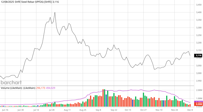 Diễn biến giá thép thanh kỳ hạn tháng 1/2026 trên Sàn SHFE. Nguồn: Barchart