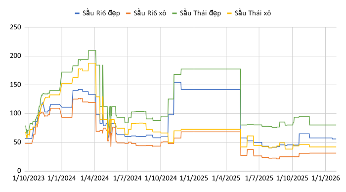 Tại khu vực Tây Nam Bộ, sầu riêng RI6 đạt tiêu chuẩn hiện được thương lái thu mua phổ biến trong khoảng 55.000 – 60.000 đồng/kg. Với hàng RI6 mua xô, mức giá dao động từ 25.000 – 28.000 đồng/kg. Trong khi đó, sầu riêng Thái tiếp tục giữ mặt bằng giá cao, khi hàng tuyển chọn được giao dịch quanh mức 85.000 – 90.000 đồng/kg, còn hàng xô phổ biến ở mức 45.000 – 50.000 đồng/kg.