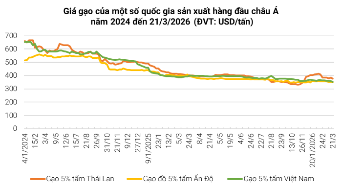Trong khi đó, giá gạo Jasmine của Việt Nam dao động từ 415 – 419 USD/tấn, gạo trắng 5% tấm ở mức 350 – 354 USD/tấn.