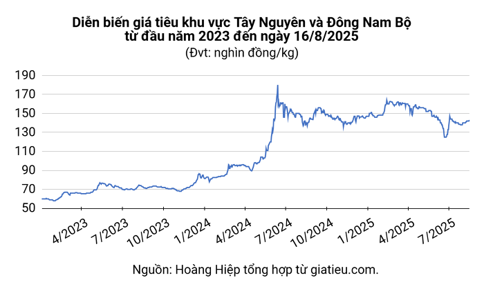 Cụ thể, tại Đắk Lắk và Đắk Nông, giá tiêu sau khi tăng 1.000 đồng/kg đã đạt mức 143.000 đồng/kg. Tại các địa phương khác như Gia Lai, Bà Rịa – Vũng Tàu, Đồng Nai và Bình Phước, giá cũng tăng tương tự, lên 141.000 đồng/kg.