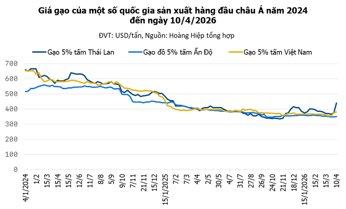 Trong khi đó, giá gạo 5% tấm của Thái Lan tăng lên khoảng 410–440 USD/tấn, so với mức 370–375 USD trước đó.