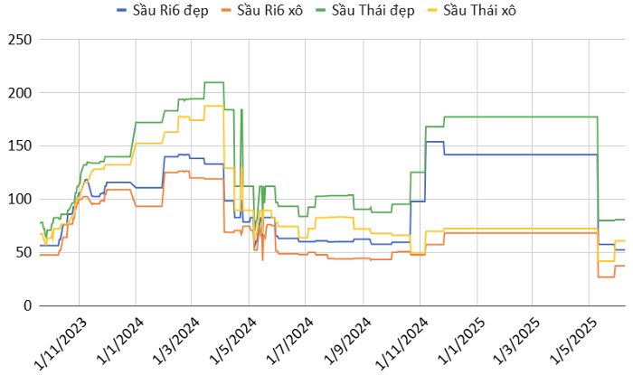 Còn tại Đông Nam Bộ, giá sầu Thái A giảm 3.000 – 6.000 đồng/kg trong khi sầu Thái B và VIP tăng lần lượt 2.000 và 5.000 đồng/kg.