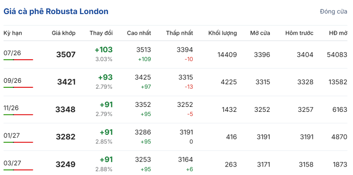 Đóng cửa phiên giao dịch ngày 23/4, giá cà phê trực tuyến robusta hợp đồng giao kỳ hạn tháng 7/2026 trên sàn London tiếp tục tăng mạnh 3,03% (103 USD/tấn) so với ngày hôm trước, lên mức 3.507 USD/tấn. Hợp đồng giao kỳ hạn tháng 9/2026 tăng 2,79% (93 USD/tấn), đạt 3.421 USD/tấn.
