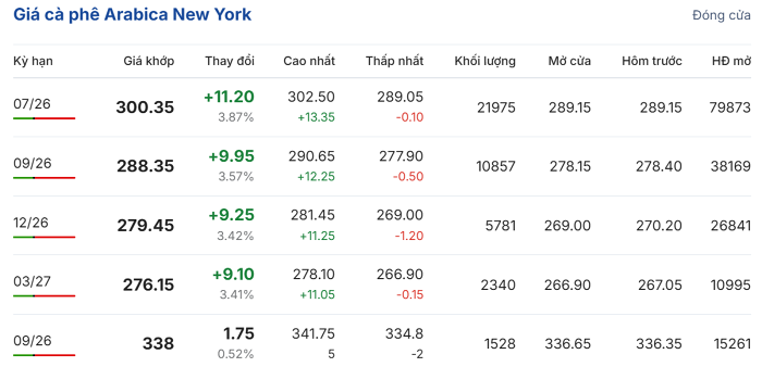 Trên sàn giao dịch New York, giá cà phê arabica giao kỳ hạn tháng 7/2026 tăng mạnh hơn, lên tới 3,87% (11,2 US cent/pound), lên mức 300,35 US cent/pound. Hợp đồng giao tháng 7/2026 tăng 3,57% (9,95 US cent/pound), đạt 288,35 US cent/pound.