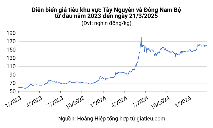 Theo khảo sát, giá tiêu sáng nay giao dịch ở mức 159.500 – 160.500 đồng/kg, tăng nhẹ 500 đồng/kg tại khu vực Đông Nam Bộ và ổn định tại Tây Nguyên.