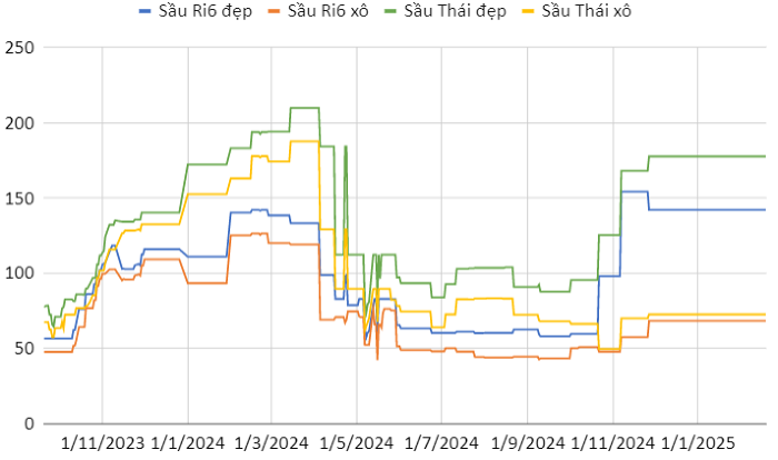 Trong đó, giá sầu RI6 loại đẹp tại miền Tây Nam Bộ, Đông Nam Bộ và Tây Nguyên đều đang dao động trong khoảng 140.000 – 144.000 đồng/kg. Còn loại mua xô có giá 60.000 – 70.000 đồng tại Tây Nam Bộ và Đông Nam Bộ, trong khi đạt mức cao hơn ở Tây Nguyên là 70.000 – 80.000 đồng/kg.